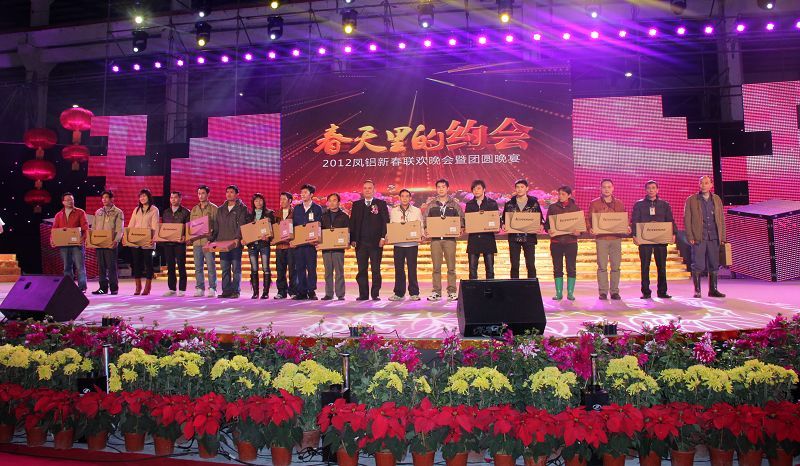 記者鐘鳳玲報(bào)道:鑼鼓歡聲送金兔,虎躍龍騰迎新春。1月15日晚18:00,鳳鋁2012年團(tuán)年晚宴暨“春天里的約會”大型聯(lián)歡晚會在我司三水基地隆重舉行。吳總、常務(wù)副總經(jīng)理劉志銘、副總經(jīng)理嚴(yán)天利、李遠(yuǎn)輝、郝樹根、許始元、林玉金等公司領(lǐng)導(dǎo)與4000多名鳳鋁員工歡聚一堂,觀精彩節(jié)目,品特色盆菜,共饗盛會。